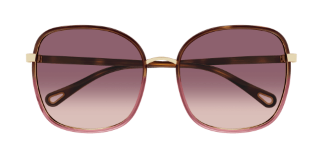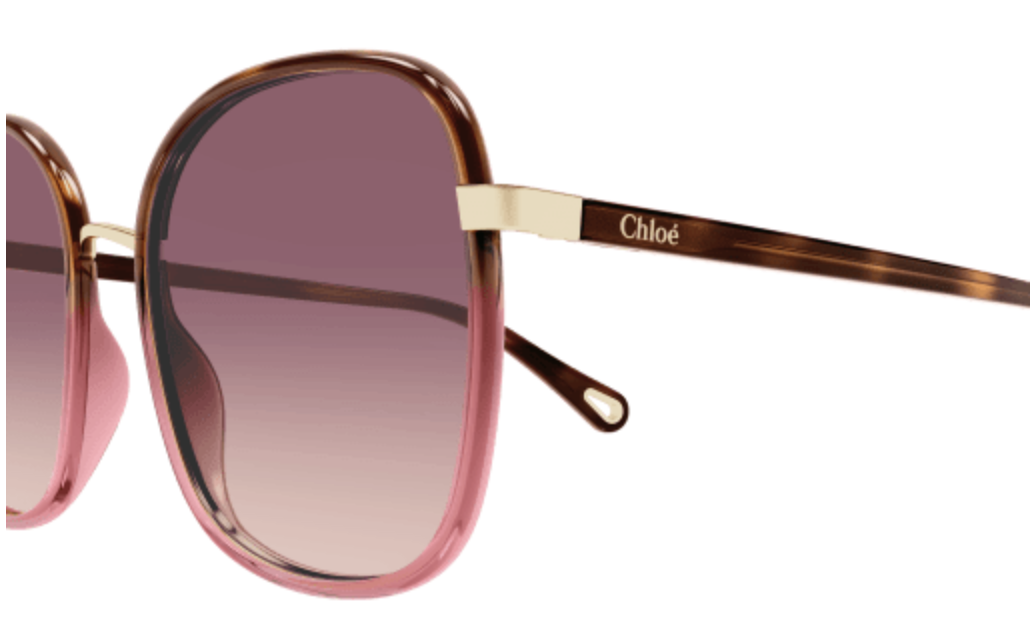 Squared combi frame with plastic gradient coloured rims, lenses and acetate temples. Metal nose bridge and metal gold griffe that liaise the front rim to the temple which have an hot stamping logo on the left one. Iconic signature teardrop cutout serving as an aesthetic and functional way to attach the Chloé eyewear jewelry at the end of the temple tips, enriched with the logo engraved.
