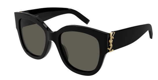 UNE FORME FÉMININE OVERSIZE ENRICHIE D’UN PETIT SPOILER SUR LE CÔTÉ POUR FAIRE ÉVOLUER LA FAMILLE DES MONOGRAMMES DANS UNE NOUVELLE CONSTRUCTION MÉTALLIQUE TRÈS LÉGÈRE ET SOPHISTIQUÉE. LE LOGO YSL AUX COULEURS GALVANIQUES EST PLACÉ À L’EXTRÉMITÉ DE LA BRANCHE APPUYÉE SUR LE SPOILER LATÉRAL AVANT.